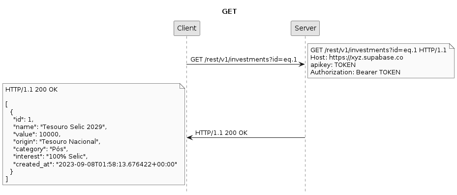 GET | /rest/v1/investments?id=eq.1 | 200 | Retorna o investimento com id igual a 1 |